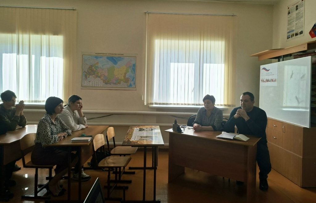 Советник директора по воспитанию Наталья Петровна Сардак пригласила за круглый стол главу Сулинского сельского поселения Андрея Александровича Палиёва, заместителя директора по воспитательной работе, депутата местного Собрания Елену Ивановну Криворотову, председателя школьной первичной организации «Движения Первых» Татьяну Сергеевну Галиуллину и активистов движения из 8–11 классов.