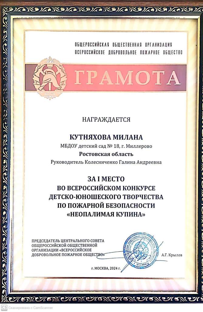 По итогам Всероссийского конкурса, проведенного в 2024 году, в номинации «Художественно-изобразительное творчество», в возрастной категории до 7 лет победителем стала воспитанница детского сада № 18 г. Миллерово Милана Кутняхова (руководитель Галина Андреевна Колесниченко). Милана успешно прошла муниципальный и региональный этапы и завоевала I место на федеральном уровне.