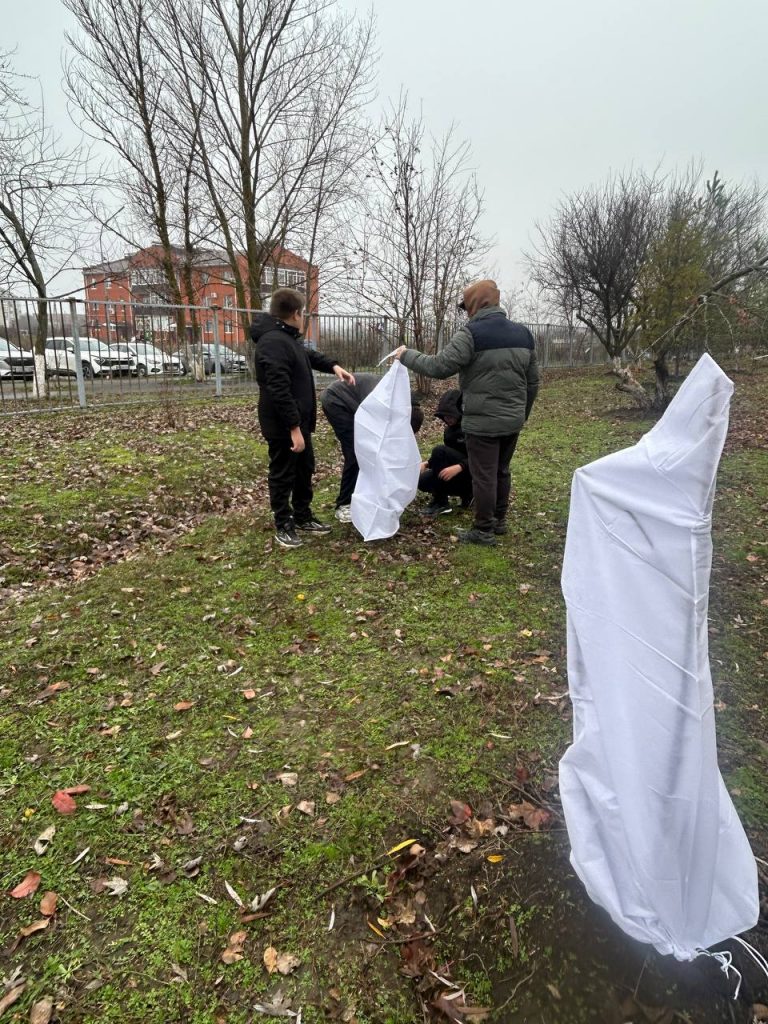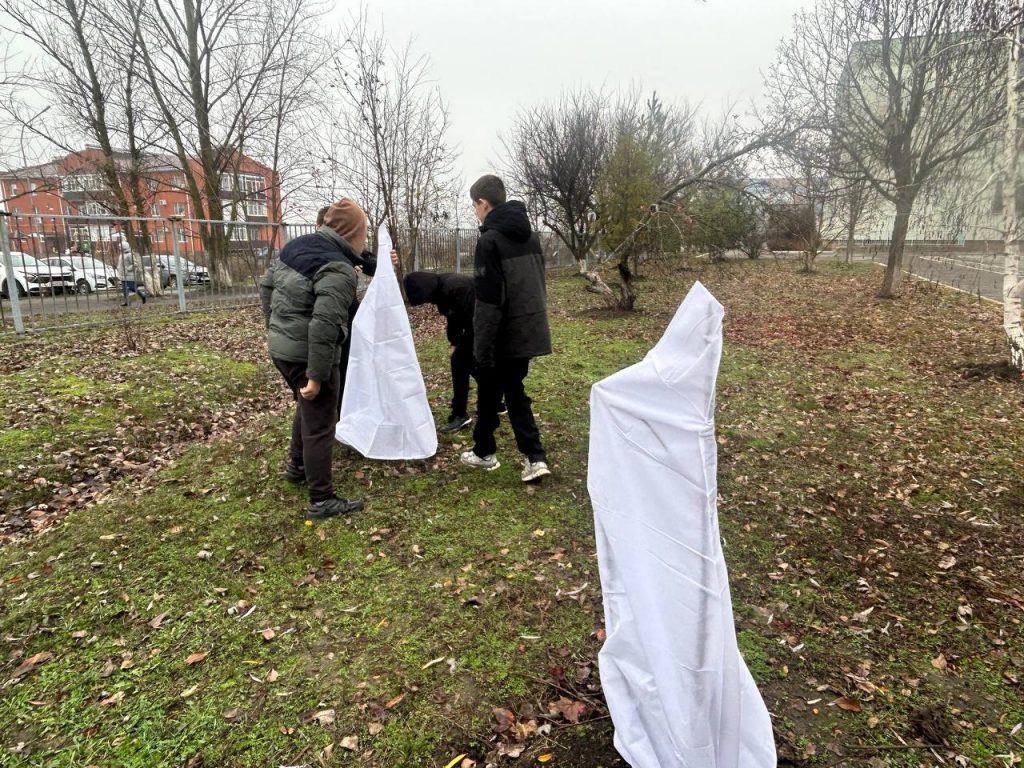 В рамках реализации социального проекта «Эковолонтер» ребята лицея № 7 работали на территории школьного двора: надевали чехлы на растущие в рекреационной зоне 2 молодых деревца павловнии.