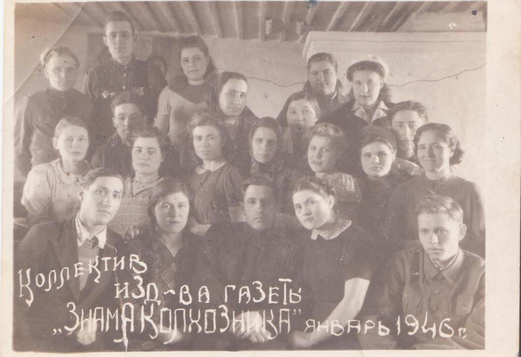 На снимке восемь мужчин разных возрастов и две молодые женщины. На заднем плане виден фрагмент кирпичной стены здания редакции и массивная деревянная дверь. Слева на стене - вывеска, справа - ящик для писем в газету. Фото хранится в Миллеровском краеведческом музее. ОбществоВ разные годы выпуском главного районного печатного органа руководили известные редакторы. Из современников дольше всех на посту главного редактора были Николай Михайлович Соловьев: с 1969 по 1987 год (19 лет) и Алексей Алексеевич Лавронов: с 1987 по 2012 год (25 лет). С декабря 2015 года коллектив журналистов возглавляет Татьяна Александровна Шевченко.