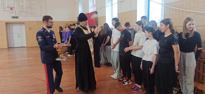По казачьей традиции с вноса знамени Миллеровского юрта, благословения и добрых напутствий настоятеля Свято-Пантелеимоновского храма иеромонаха Димитрия (Яроцкого) начался турнир по казачьему многоборью в школе № 2.