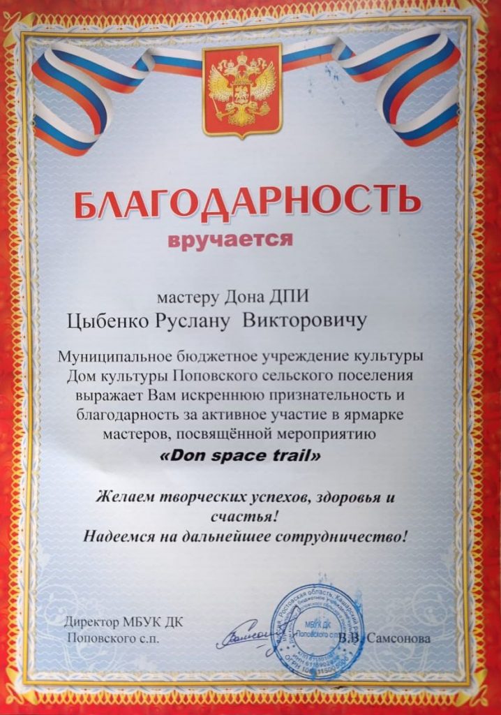 В рамках праздничной программы так же состоялись концертные выступления, выставки мастеров декоративно – прикладного искусства. Со своей выставкой в мероприятии принял участие мастер ДПИ ДК Миллеровского района Цыбенко Руслан Викторович. За участие в празднике мастер был награжден благодарственным письмом организаторов.