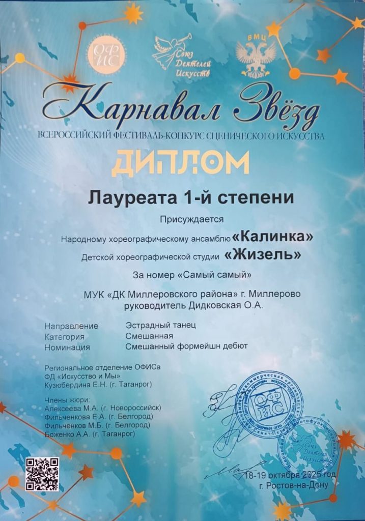 Миллеровские звездочки, награждены дипломами лауреата 1 степени за танец «Самый, самый», для детей студии «Жизель» — это был дебют и лауреата 2 степени за танец «Кадриль». В фестивале участвовало множество коллективов из разных городов Ростов-на-Дону, Новороссийск, Краснодар, Новочеркасск, Таганрог, с. Заветное, с. Кулешовка и многие другие. Несмотря на огромное количество участников, ребята показали себя на высшем уровне.