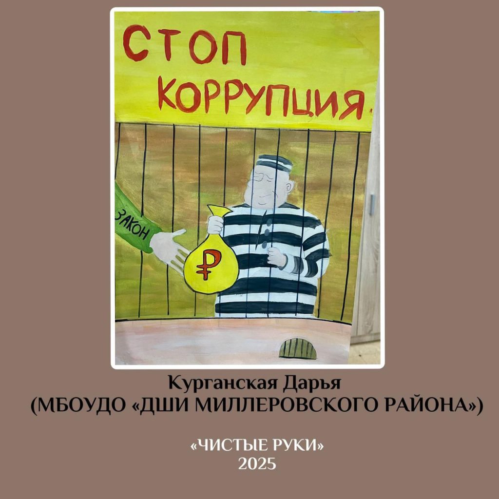 В числе пяти лучших плакатов на тему противодействия коррупции — работы талантливых миллеровских школьников: Натальи Бабкиной, Дарьи Курганской, Анны Войтенко (детская школа искусств), Полины Шевченко (лицей №7), Ирины Яценко (центр «Янтарь»).