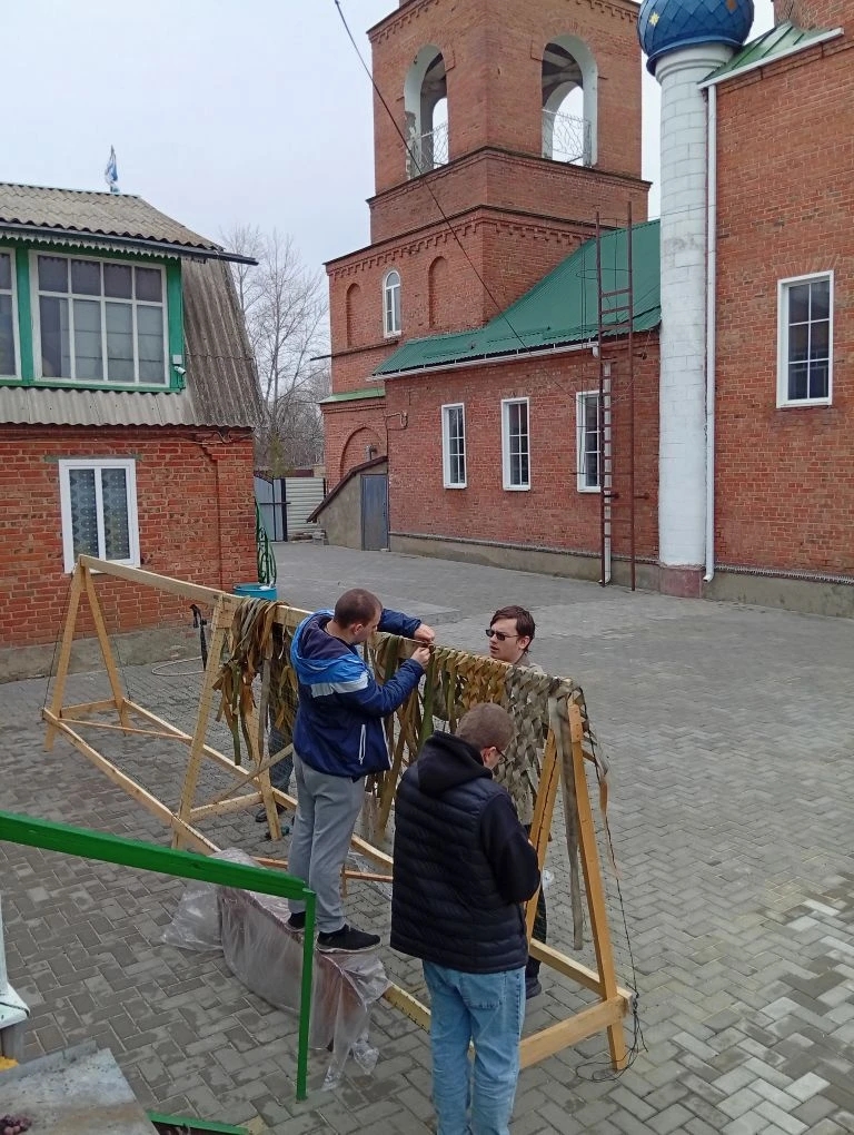 Работы ведутся на территории прихода святого апостола Андрея Первозванного г. Миллерово. По поручению настоятеля иерея Симеона Есина с прошлого года участники православной волонтерской группы «Мы вместе» плетут масксети в здании храма в свободное от богослужений время. Деньги на закупку материалов собирают всем миром.