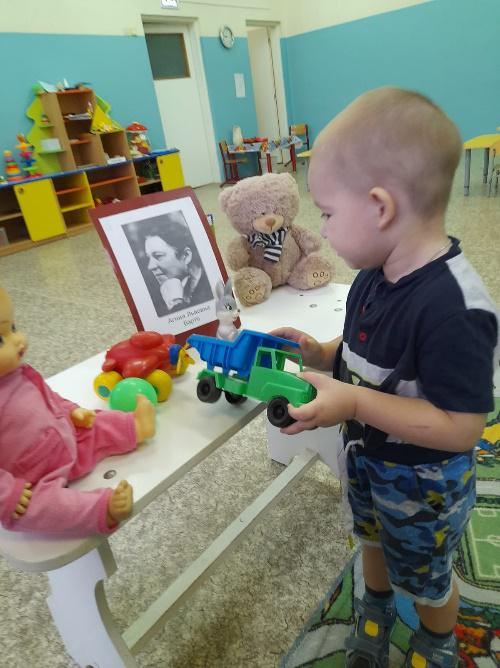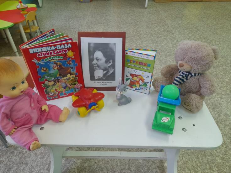 Ребята, вместе с воспитателем Плужниковой Анной Дмитриевной, отправились в путешествие по миру поэзии Агнии Львовны. Ребята рассматривали иллюстрации, смотрели мультфильмы по произведения Барто: «Игрушки», «Мячик», «Кораблик», играли в ритмическую игру игрушками, обыгрывали любимые стихи «Лошадка» «Грузовик»; собирали пазлы. В книжном уголке была оформлена выставка книг Агнии Барто.