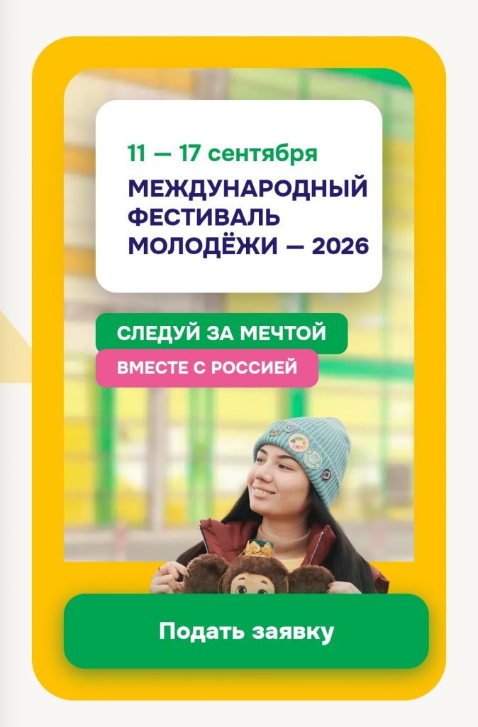 Вице-премьер Дмитрий Чернышенко подчеркнул, что для тех, кто не сможет приехать лично, будет обеспечен онлайн-доступ к программе Фестиваля. Подать заявку на участие в Международном фестивале молодёжи можно до 30 апреля на сайте wyffest.com.