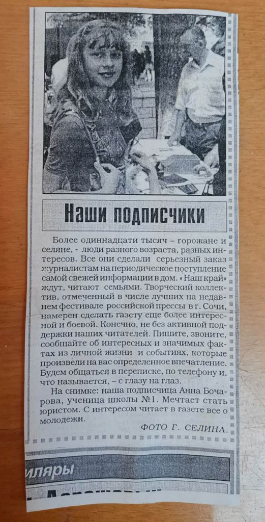 Тут надо уточнить, что Аня однажды уже становилась героиней публикации, которая бережно хранится в семейном архиве. В 2004 году, когда ей было 14 лет, она, видимо, по поручению опять же бабушки Валентины Федоровны пошла на почту оформить подписку на «Наш край». Вероятно, это был специально проводимый газетой День подписчика, когда читатели встречались с журналистами, общались в почтовых отделениях. Тогда Аню сфотографировал наш фотокорреспондент Геннадий Павлович Селин, который также долгие годы активно и увлеченно работал в «Нашем крае» и оставил в архиве много замечательных снимков.