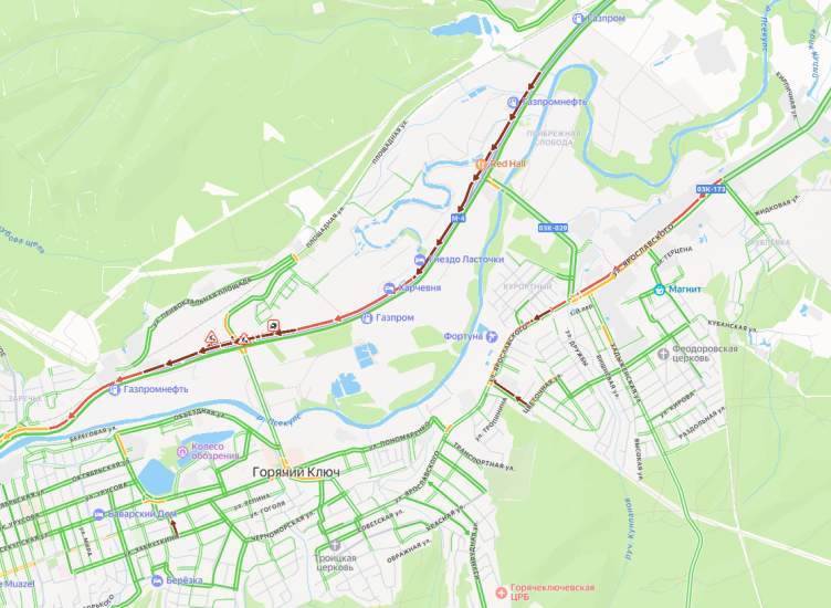 Автомобилисты, движущиеся по трассе М-4 «Дон» в районе Горячего Ключа, застряли в глухой пробке на участке с 1382-го по 1384-й км, которая длится уже более часа, согласно данным сервиса «Яндекс. Карты». Этот участок дороги охватывает въезд в курортный город и продолжается до известной достопримечательности — скалы Петушок.