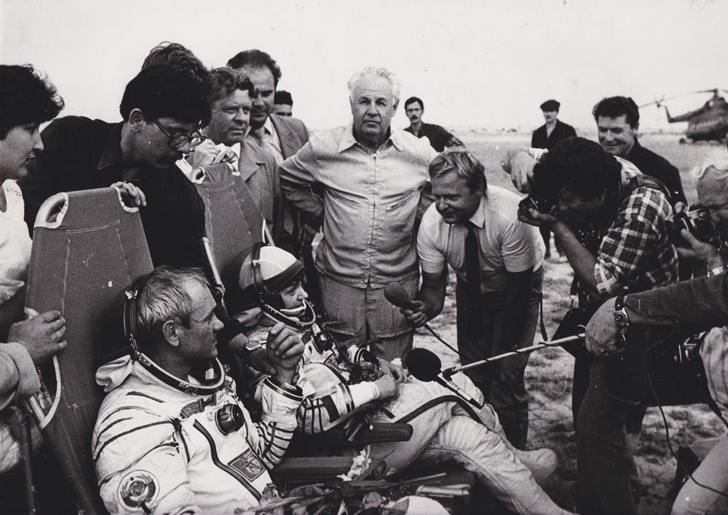 А. Н. Ефимов встречает космонавтов «Союза Т-12» В. Джанибекова и