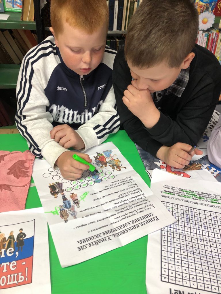 Школьники знакомились с национальными костюмами, украшениями, слушали сказки и песни. Они отвечали на вопросы викторины «Загадки народов России», разгадывали тематические кроссворды. Также ребята играли, слушали притчи и предания, знакомились с пословицами и поговорками, в которых народы хранят свой жизненный опыт.