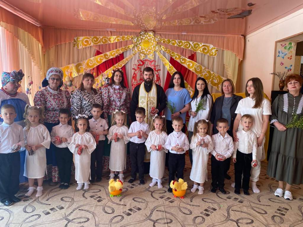 В гости к приходил настоятель храма Покрова Пресвятой Богородицы слободы Никольская иерей Георгий Николаевич Лукащук. В конце праздника окропил всех воспитанников святой водой. Закончилось мероприятие раздачей раздачей куличей, которые приобрели родители воспитанников каждой возрастной группы.