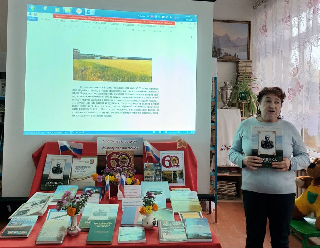 «На юге великой России, где степь встречается с железными дорогами, а прошлое шепчет будущему, раскинулся Миллеровский район. Миллеровский район – 60-летняя история труда, памяти, любви к родному краю» — слова гордости и уважения яркого информационного видеоролика Миллеровского телевидения открыли краеведческий День Информации в Фоминской библиотеке.