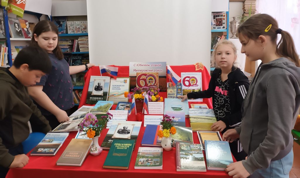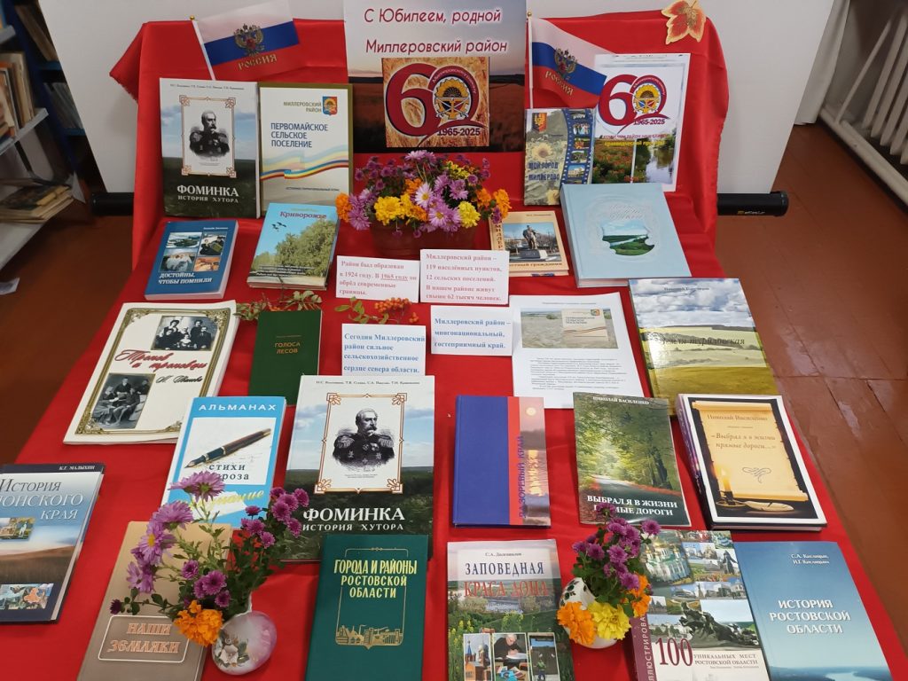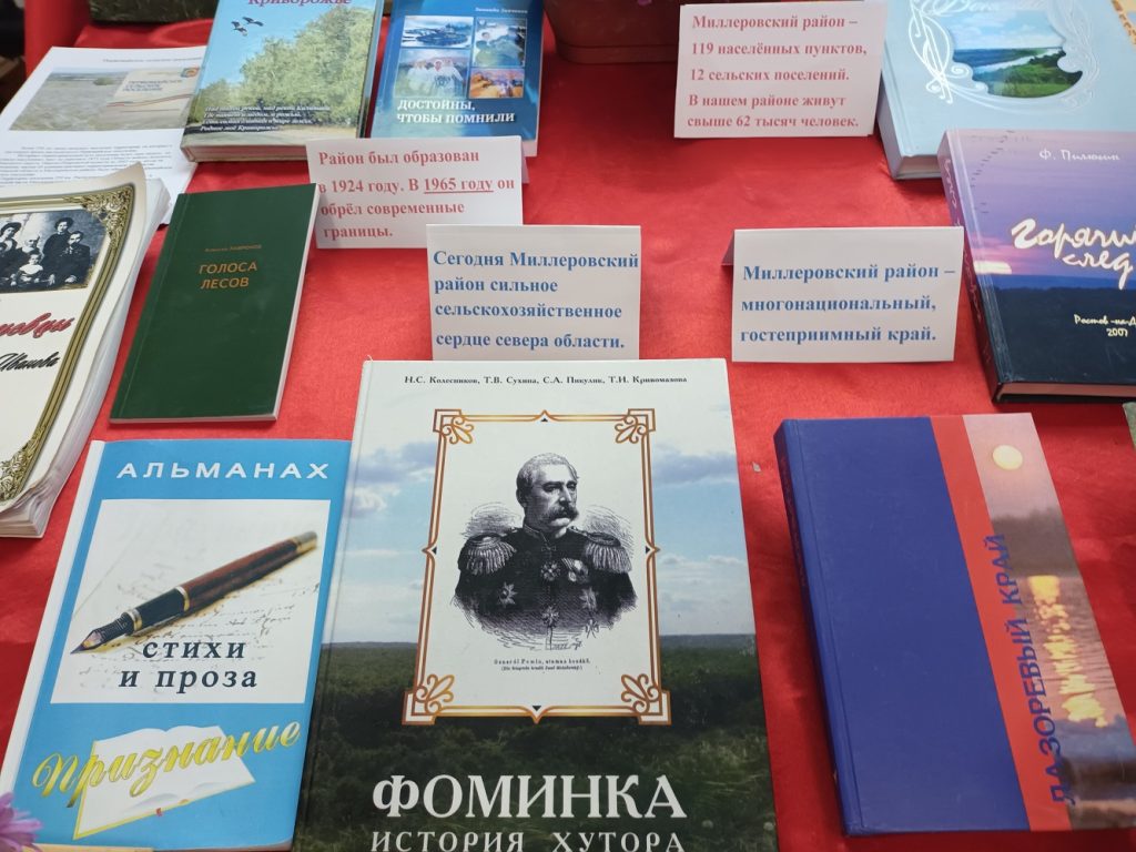 Вниманию учащихся была представлена книжная выставка «Малая родина – большая история». Выставка призвана показать многогранность истории и современности Миллеровского района через документальные источники, краеведческие издания и визуальные материалы. История Миллеровского района – это не только даты и факты, но и живая связь времён, которую сохраняют авторы создающие своим ответственным, кропотливым трудом, краеведческие книги и материалы, и люди читающие.
