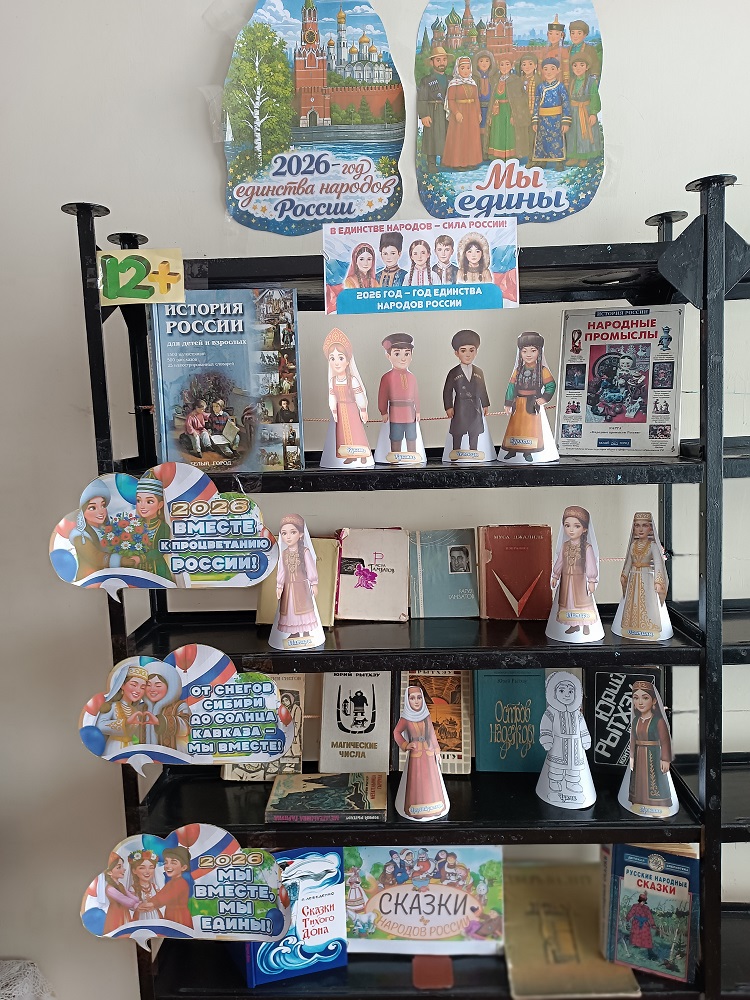 В Кудиновской библиотеке оформлена библиотечная выставка-инсталляция «В единстве народов – сила России», приуроченная к объявленному в 2026 году Году единства народов России.