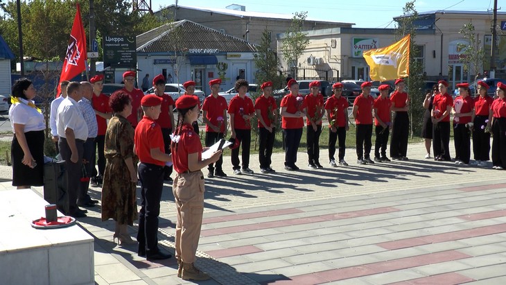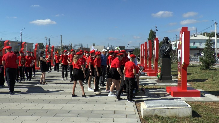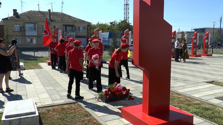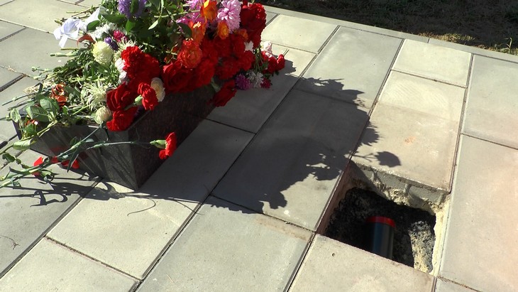 Затем представители юнармии под песню «Журавли» разместили капсулу с землей у подножия стелы.