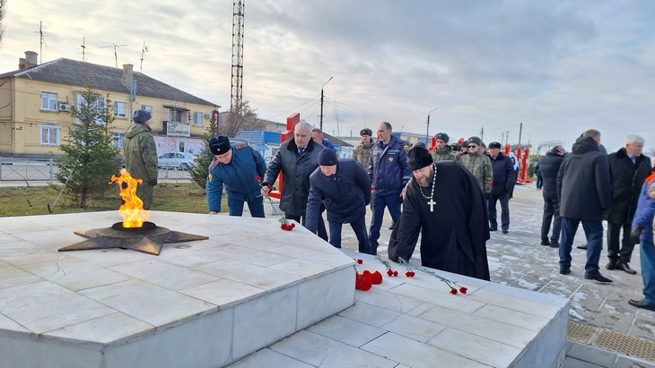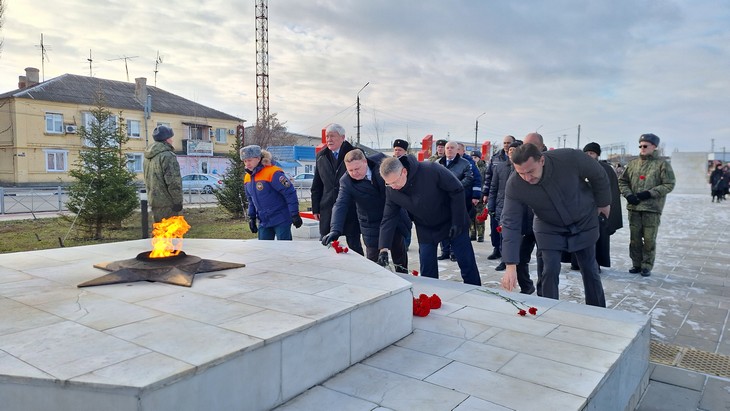 Свой визит в город рабочая группа совместно с миллеровскими спасателями и представителями районной власти начала с церемонии возложения цветов к мемориалу «Вечный огонь» и стеле участникам СВО. Это – дань памяти 80-летию Великой Победы.