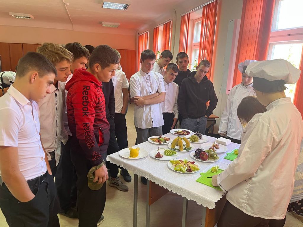Мастер производственного обучения И. Е. Колотухина, и студенты 2-3 курсов провели мастер-класс по карвингу «Фруктовый рай»- изготовили цветы из яблок, дельфинов, павлина, ежиков из фруктов и ягод.