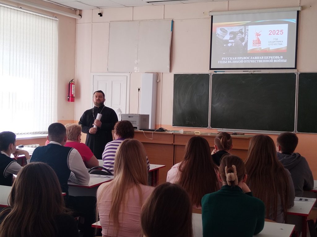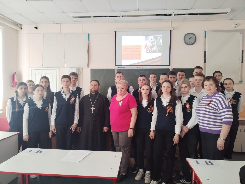 В третьей декаде апреля в 10-«Б» классе школы №8 г. Миллерово прошел Урок мужества, посвященный 80-летию Победы в Великой Отечественной войне. В мероприятии принял участие: настоятель храма апостола Андрея Первозванного иерей Симеон Есин.