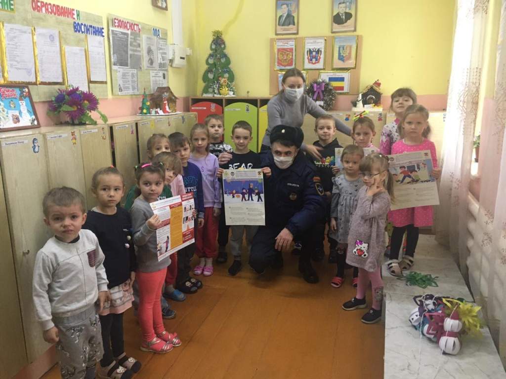 Сотрудник ПЧ № 240 Р. Ф. Ковалев рассказал о правилах пожарной безопасности во время Новогодних праздников. Воспитанники закрепили знания о правилах пользования пиротехникой и своих действиях при различных возгораниях. Им подарили тематические красочные плакаты, которые разместили в уголках пожарной безопасности.
