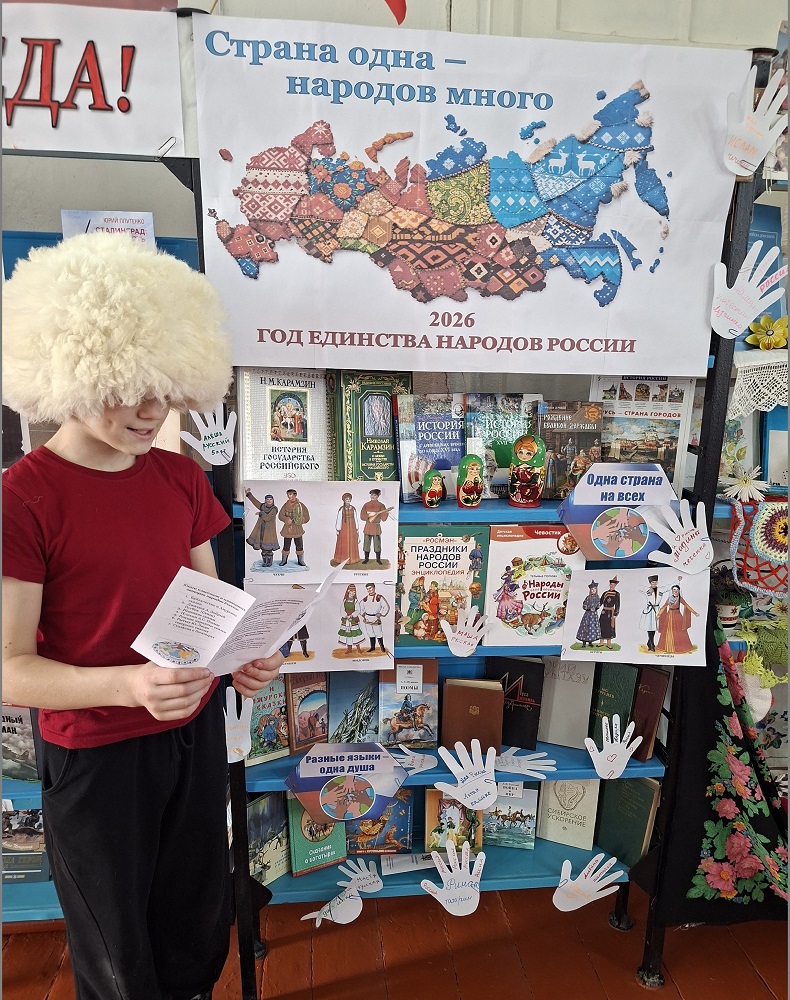 Для жителей села подготовили буклеты «Многоцветье единой нации» и «Россия сквозь века вместе». В них рассказывается о том, сколько народностей проживает в России, и о книгах, доступных в фондах библиотек. Буклеты раздавали на улице всем односельчанам.