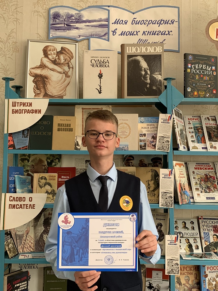 Центральную детскую библиотеку на конкурсе представлял Арсений Бандурин, учащийся гимназии №1. Его видеоролик«Шолоховские места в городе Миллерово» занял первое место в номинации«Путешествие в шолоховский мир». В нем – история появления памятника нашему знаменитому земляку, улицы, названной его именем, и мини-музея в здании железнодорожного вокзала.