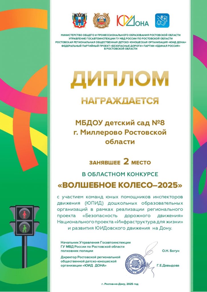 Команда ЮПИД «Светофорчик» детского сада № 8 заняла 2 место в областном конкурсе «Волшебное колесо – 2025». Участники конкурса проявили себя на четырех увлекательных станциях, где выполняли задания, направленные на развитие знаний и навыков безопасного поведения на дорогах.