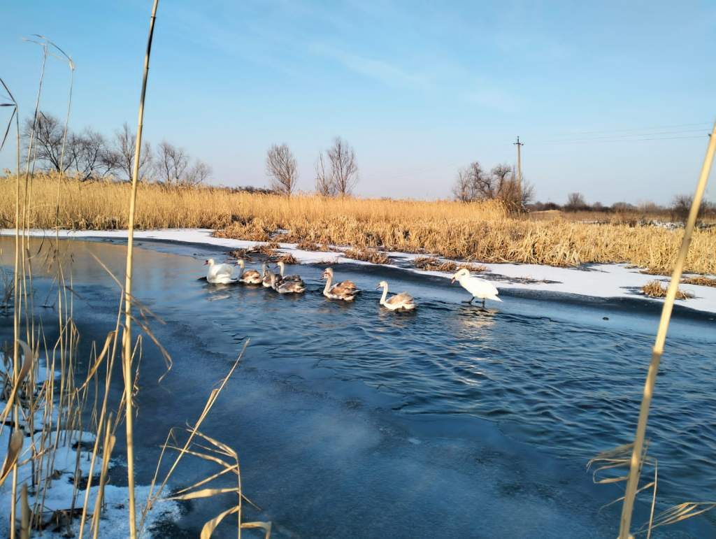 Жители сл. Титовка Титовского сельского поселения обеспокоены судьбой семьи лебедей из 9 голов, оставшихся зимовать на реке Деркул в селе.